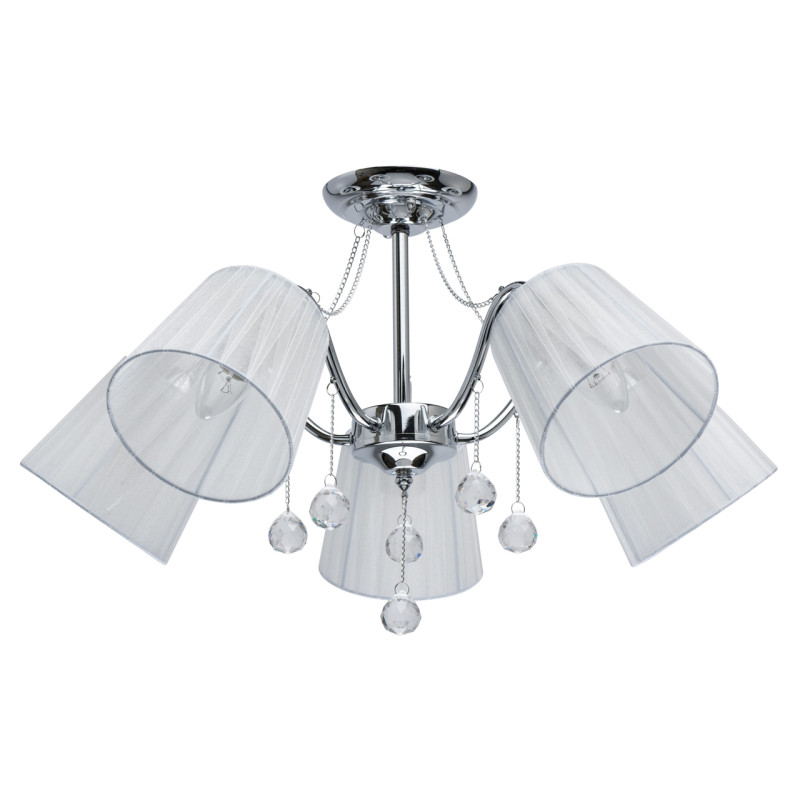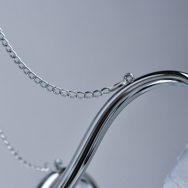 Основание светильника выполнено из сплава металла и гальванизировано в цвет хрома. Абажуры из прозрачной органзы белого цвета с термостойким акрилом внутри. Абажуры отделаны кантом сверху и снизу, прошиты. Светильник декорирован металлическими цепочками в цвет основания и прозрачным хрусталем в форме шара.