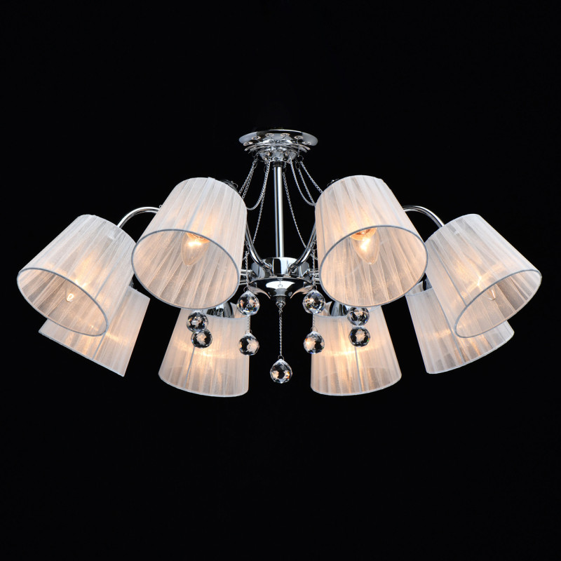 Основание светильника выполнено из сплава металла и гальванизировано в цвет хрома. Абажуры из прозрачной органзы белого цвета с термостойким акрилом внутри. Абажуры отделаны кантом сверху и снизу, прошиты. Светильник декорирован металлическими цепочками в цвет основания и прозрачным хрусталем в форме шара.