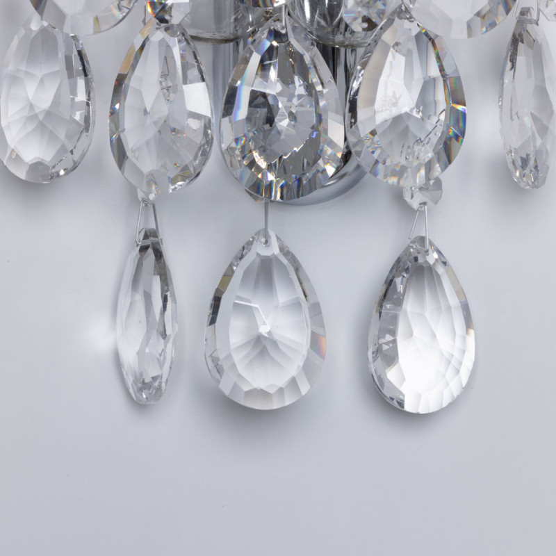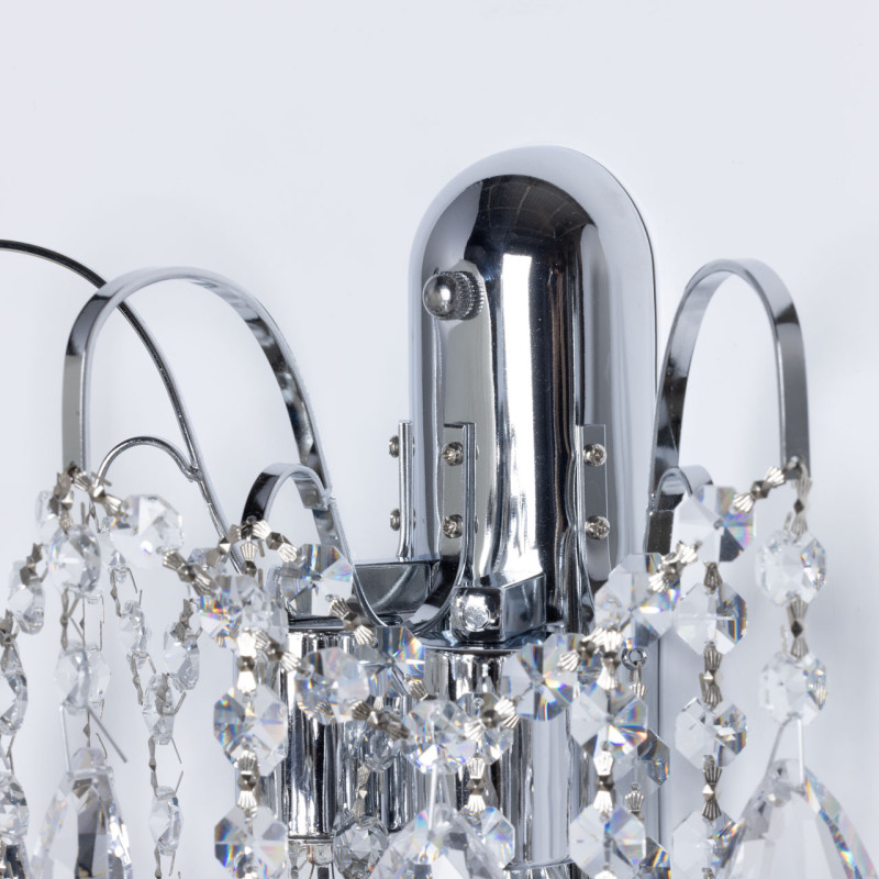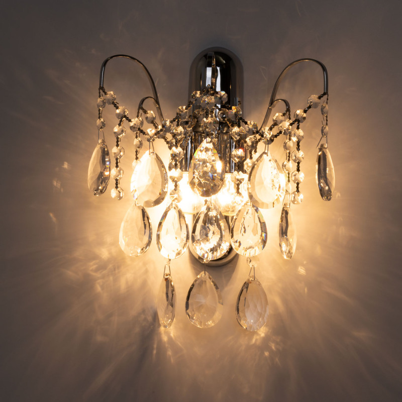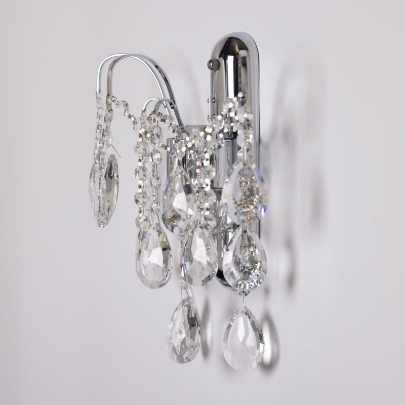Металлическое основание светильника гальванизировано в цвет хрома. Настенное бра декорировано прозрачным хрусталем.