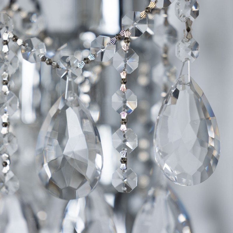 Современный цвет хрома придаст современности интерьеру.Прозрачный хрусталь создает красивую игру света.Заменяемые источники света удобны в эксплуатации.