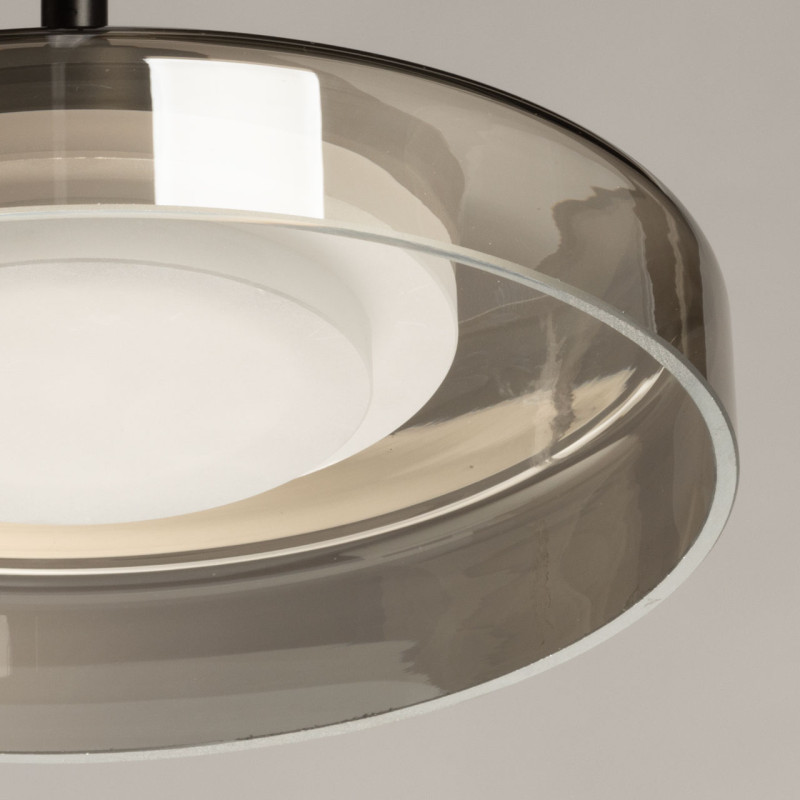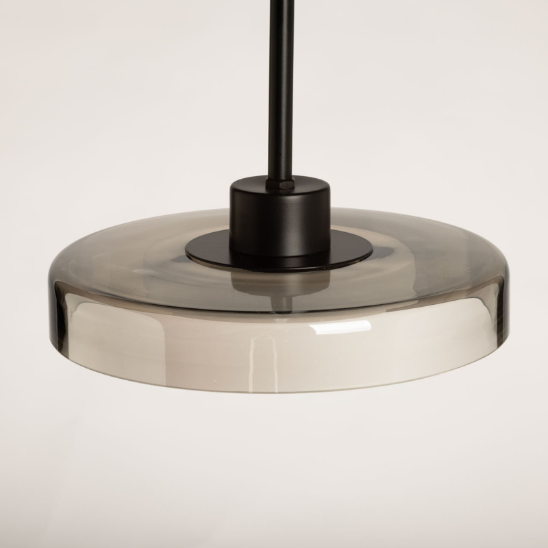 Черный цвет основания создает сдержанный и стильный образ. Стеклянный плафон дымчатого цвета придает люстре элегантности. Светодиодный источник света закрыт матовым акрилом, создавая равномерное и комфортное освещение. Качественные светодиоды экономичны и безопасны. Возможность регулировать комфортную высоту.