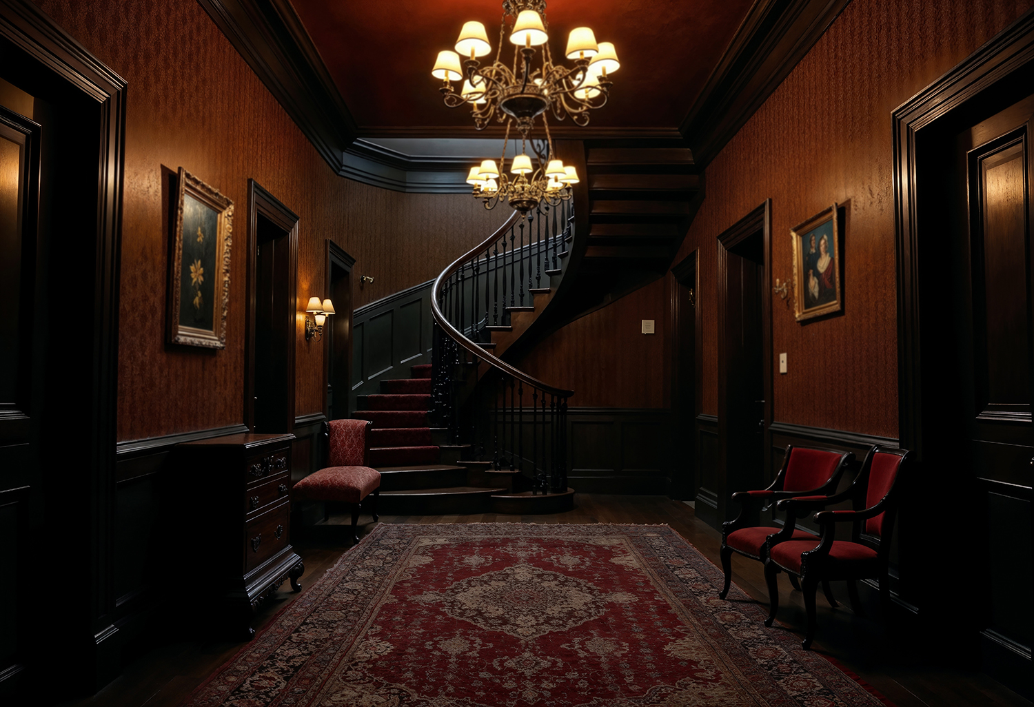 - Кабинет как в «Леопарде»: темные деревянные панели, массивный письменный стол, кожаное кресло, глобус на подставке, портьеры из тяжелого бархата