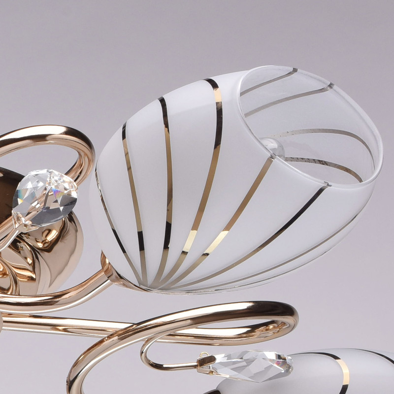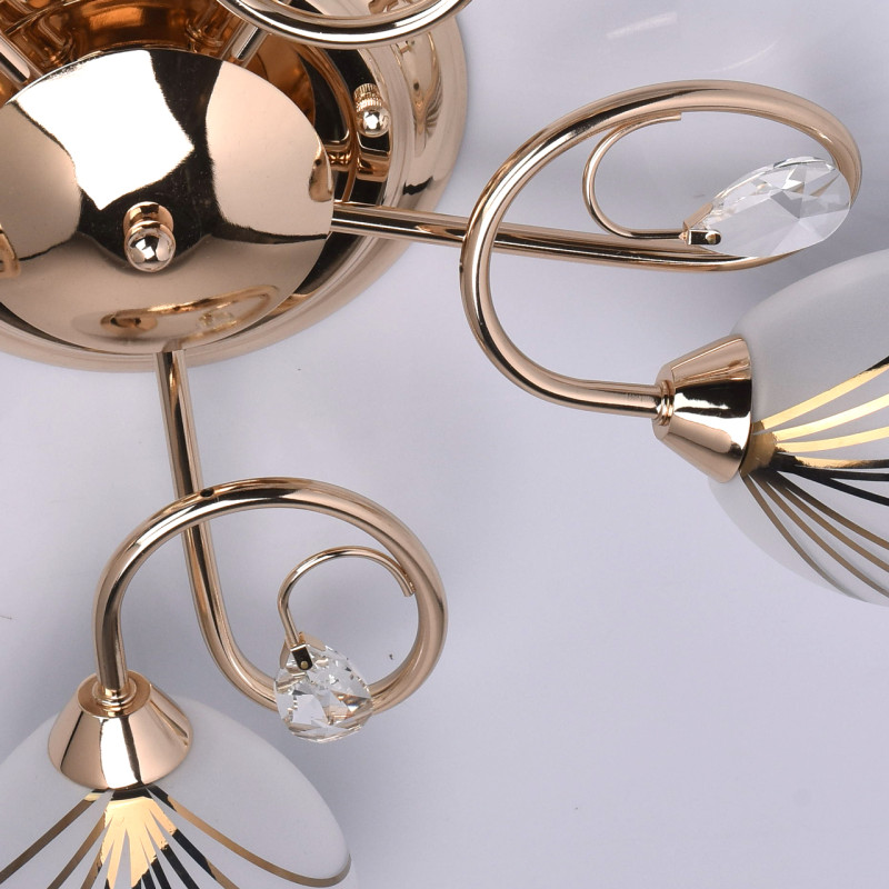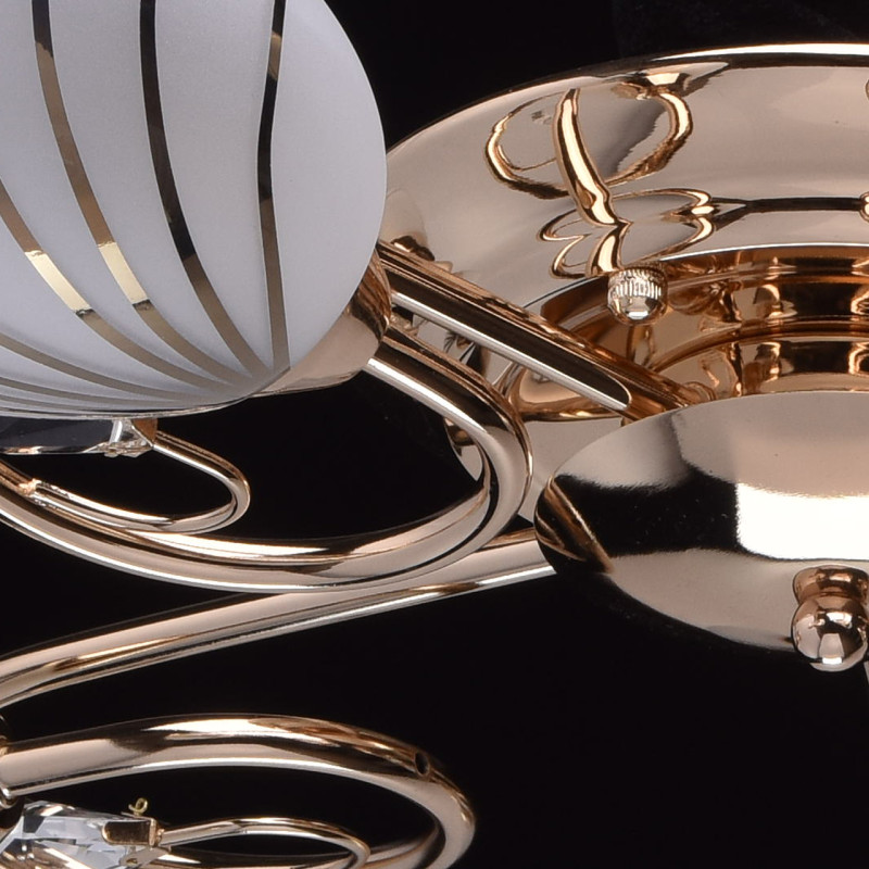 Основание светильника выполнено из металла и гальванизировано в цвет золота. Потолочная чаша, корпус и держатели плафонов изготовлены по технологии обработки на токарном станке, рожки и завитки изогнуты по технологии проката на роликовом станке.Светильник декорирован стеклянными плафонами, отлитыми в форму. Плафоны матированы, гальванизированы по трафарету в цвет золота. Края плафонов обработаны по технологии оплавления. Декоративные элементы: прозрачное хрустальное стекло миндалевидной формы.