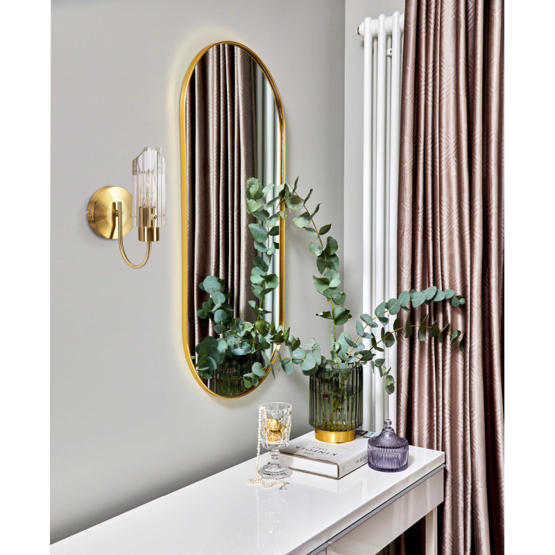Металлическое основание настенного бра гальванизировано в цвет самородного золота. Вертикальное бра декорировано прозрачным фактурным стеклянным плафоном вытянутой формы.